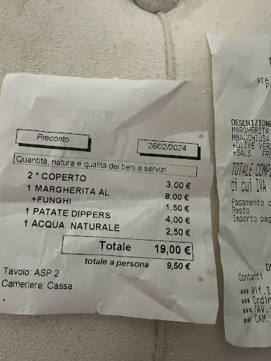 Condivido la mia esperienza, davvero pessima e negativa con il locale. Arrivo lunedì sera alle ore 22:45, visto l’ora con molta educazione ho chiesto se era possibile fare una pizza e una porzione di patate DIPPERS con la buccia da portare. Un ragazzo alla cassa inizialmente molto gentile mi ha invitato ad accomodarmi al tavolo ma ho ribadito che non volevo disturbare visto l’ora, alla fine con la sua falsa cortesia mi ha convinto a sedermi dicendo che tanto chiudevano a mezzanotte. Ho chiesto una semplice pizza margherita con salame e “aggiunta” di funghi. Quindi ricapitolando la mia richiesta è stata UNA PIZZA base margherita con salame CON AGGIUNTA di funghi più una porzione di patate dippers(da loro menù 4 euro) e una bottiglia d’acqua. Il loro conto da SCONTRINO CHE ALLEGO COME PROVA E’ stato: Patate mbacchiuse 10 euro Pizza con aggiunte di olive verdi mai richieste Per la modica cifra di 20 euro! Ho fatto notare l’errore e il gentilissimo ragazzo della cassa si è ricordato dopo di mettere il coperto di 3 euro e l’acqua.. morale della favola ambiguità e disonestà, e 0 modi di fare con il cliente. Velatamente voleva “offrirmi il coperto e l’acqua” appena ho fatto notare il suo errore per delle patate diverse da quelle che ho mangiato me l’ha fatti pagare! Non commento o spendo aggettivi in merito, fortunatamente Cosenza è pieno di pizzerie migliori di questa, che ovviamente è rinomata perché il cosentino medio non capisce di vera pizza napoletana.. ovviamente il mio consiglio è di guardare BENE il conto che viene emesso, non è per le 3/4 euro solate ma per il gesto davvero puerile. Mi auguro che leggano il mio commento chissà imparano a comportarsi con i clienti.. per uno perso ce ne sono 10 nuovi ma prima o poi la vera qualità...