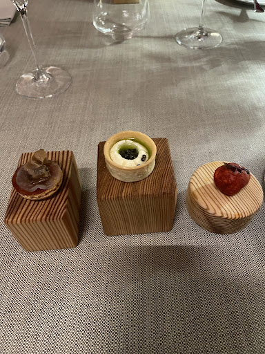 First they brought us on the house some appetisers on wooden cubes (three 2cm things). They looked cute but the tase was horrible. The cheese ball in boia had literally no taste. The tart was mid and the macaron was indeed ok.
