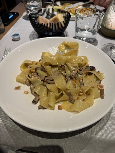 delle tagliatelle artigianali alle 30 uova con funghi trifolati, perfettamente mantecate e ricche di profumi di bosco,