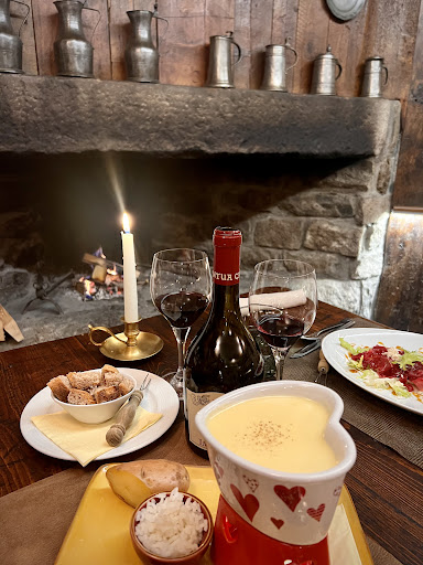 Purtroppo la nostra cena non è stata all’altezza delle aspettative (e del prezzo pagato). Avevamo un tavolo davanti al camino, peccato che non siano stati in grado di tenerlo acceso per praticamente tutta la serata. Ordiniamo una Fonduta con crostini, riso e patate. Ci portano dei pezzetti di pane del giorno prima (quelli non si definiscono crostini) UN cucchiaio di riso e una patata lessa spezzata a metà con la buccia. Una messata di cervo, buona. Un civet di capriolo con polenta, discreto ma assolutamente niente di indimenticabile. Chiediamo al maitre un vino da 30€ e gli facciamo qualche domanda sulla bottiglia. Lui allora ci suggerisce di provarne un altro, che si è poi rivelato essere un buon vino ma al momento del conto abbiamo scoperto che si trattava di una bottiglia da 50€. Un comportamento alquanto scorretto, se si propone una bottiglia che costa quasi il doppio di quella scelta, come minimo andrebbe fatto presente. Morale, 135€ per una cena deludente sotto tutti i fronti. Abbiamo speso meno e mangiato molto meglio in altri ristoranti limitrofi di un livello decisamente superiore sotto tutti gli aspetti (La Sapiniere e L’Auberge de la Maison per citarne un...