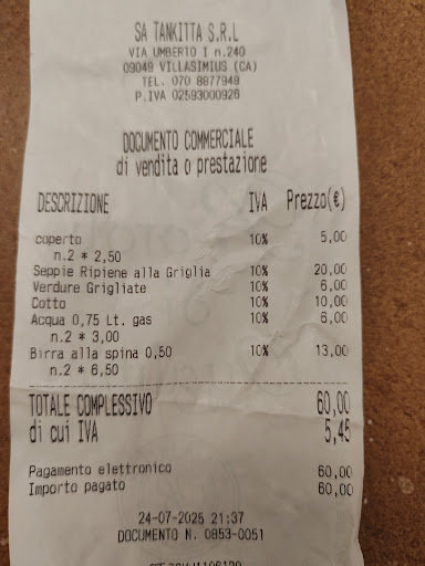 Read moreSa Tankitta serves the best seafood in town. We dined for lunch as we were unable to get a dinner booking due to popularity! Advance booking recommended. We skipped antipasti to allow our stomachs enough space for primo, secondo and dolce, however, we spied dishes being delivered to other tables and they looked delicious. We both had a pasta dish, frutti di mare, which is tomato based, was amazing, the sauce was flavoursome, with fresh and varied seafood, the prawns were particularly tasty and delicate. Spaghetti alle vongole, was good too. Fritto misto was tasty, and big portion. However the star of the meal was the whole seabass. It was cooked to perfection, soft flaky fresh fish, cooked whole with a salted crust which was outstanding! I will be dreaming of this until I go again in the future... if we could ever get another booking. However, the tree in the garden is beautiful, but inside could do with redecorating, outdated wallpaper and the TV in the corner makes it feel cheap. We didnt try the wines but there was a good selection. The main reason for not giving 5 stars, was the service. Staff were fine, but not friendly, seemed we were a bit of an inconvenience to them and they...
