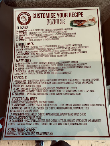 Read moreIl personale è cortese ed i prodotti sono di buona qualità. Un plus il fatto di poter avere le piadine a casa. Un neo enorme sono i prezzi: decisamente spropositati per un pasto a base di piadina! La possibilità di poter operare per un impasto più leggero dall'originale (molto pesante) è ottima, ma in altre piadinerie non si viene caricati di 1 euro per il cambio, che in rapporto è circa il 15% del costo totale. 5 piadine a 35 euro mi sembra decisamente troppo. Spendo di meno...
