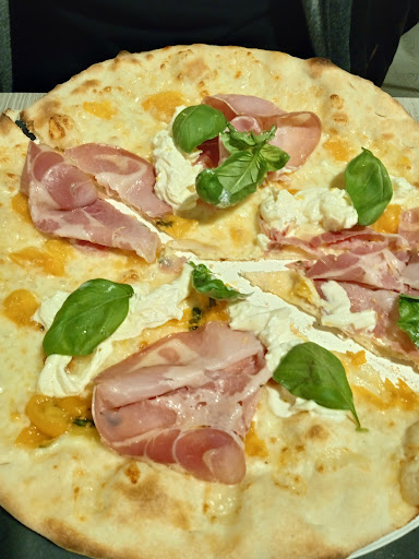 Dando un'occhiata alla vetrina è possibile farsi già un'idea del menù. Varcando le ampie vetrate del moderno locale, siamo statɜ accoltɜ da una squadra di giovani briosɜ e professionalɜ. In particolare il cameriere che ci ha accompagnatɜ, dopo aver controllato i greenpass, ci ha mostrato il tavolo dove accomodarci e rapidamente ci ha fornito dei menù. Dopo averci lasciato un tempo adeguato per scegliere, è tornato da noi e con molto garbo ci ha consigliatɜ. Siamo statɜ felici di accettare il consiglio: anche la pizza scelta da noi era buona, bassa, ingredienti di qualità e ben dosati. Quella consigliata da lui però -pizza del mese con impasto e cornicione alla napoletana, farcita con crema di carciofi, speck saltato in padella, fiocchi di burrata aggiunti fuori dal forno e grattata di lime-, beh, era veramente ottima. Certamente di gran lunga sopra la media delle pizze a Cremona. Così come il servizio, informale e professionale al contempo, l'attenzione per la cura e la pulizia degli ambienti, il conto; qualità ad un prezzo onestissimo. A proposito di qualità, all'interno del locale è anche possibile acquistare miele artigianale a km0. Non ci siamo fattɜ sfuggire l'occasione di portarne con noi un barattolo.