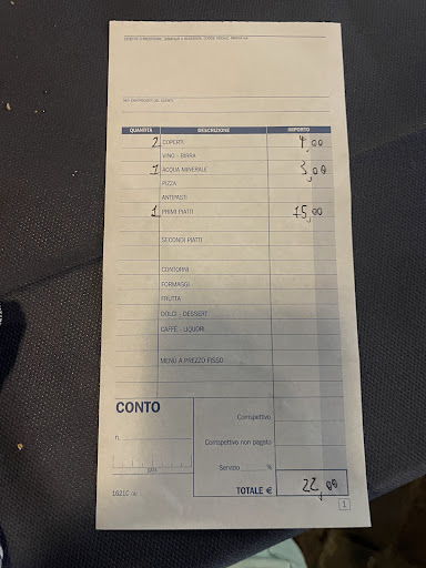 I thing I never tolerate at restaurants is menu without prices and this is exactly what happened to me at this place. Both waiter and the chef did not speak English and they were not able to explain any prices or help us with ordering in any way. We have ordered Pasta Frutti di Mare which was good , however mixed with a lot of oil which can add taste to almost any dish. After all they didnât even create a tax receipt, just a handwritten note. The service wasnât nice to us and even havenât tried to be , maybe itâs because we were foreigners or because we have ordered only one dish for two. At 19:30 there was no one eating in this place , which adds even more peculiarity to this situation as all other places where flooded with people at this time. I wish I havenât had this experience as I felt fooled and...