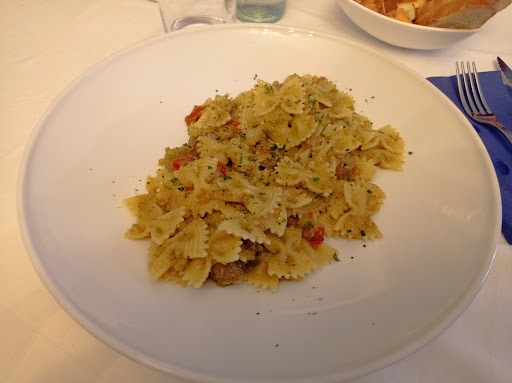Bis di primi serviti con mestolo direttamente nel piatto , tipo la cena di Capodanno di Fantozzi: il risotto bianco sciapo con retrogusto di funghi presi in piscina e 4 paccheri Scotti ed incollati ai frutti di mare per provare l esperienza mari e monti nello stesso piatto, tipo Heidi in costume da bagno : peccato i funghi inesistenti e 4 cozze rotte immangiabili ad accompagnare i paccheri.