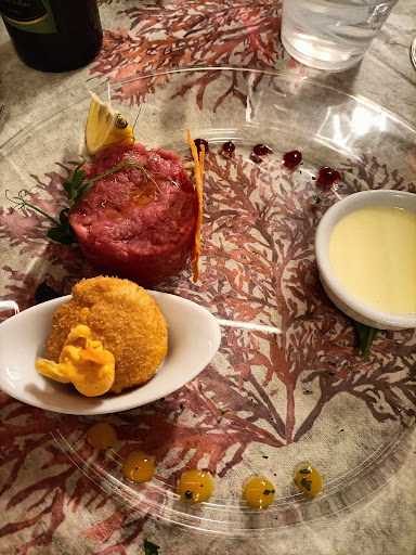 Read moreCibo spaziale e personale super gentile. Abbiamo mangiato benissimo, dall'entree offerto, che è un arancino gustosissimo al nero di seppia con bresaola, al dolce. Tutti i piatti sembrano quadri dipinti, impiattati in maniera artistica ed elegante. Le porzioni sono però giuste (non gourmet due assaggini) e si esce davvero soddisfatti! L'antipasto, battuta di vitello e millefoglie di peperoni, entrambi davvero gustosi e ben abbinati, ma il pezzo forte è primo, davvero da leccarsi i baffi: plin bicolore di mare. Non sono una grande appassionata di primi di pesce, ma credo che questo sia stato uno dei migliori della mia vita!! La pasta talmente sottile da essere tutta cotta in modo omogeneo, gamberi puliti alla perfezione e mix di sapori che esplode in bocca, compresa la bisque! Guancetta che si scioglieva in bocca. Dolci spettacolari, belli e buoni, si sente che gli ingredienti sono freschi e di prima qualità . La crema pasticcera davvero da leccare il piatto!! Davvero soddisfatti, in una parabola ascendente di bontà, un piatto più buono dell'altro, in un continuo WOW! piccolo suggerimento: il soffitto del ristorante è bellissimo, ma il resto della stanzona in cui sono i tavoli non è valorizzato.. servirebbe qualche comò antico o qualche quadro, per valorizzare la stanza e l'ubicazione, in pieno...