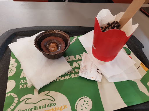 Abbiamo cenato qui ieri sera (lunedì…. dopo cinema), il locale era praticamente vuoto, noi eravamo in 3. Ambiente molto freddo. Servizio completamente da rivedere, personale inadeguato, non maleducato, ma sicuramente allo sbando, non oso immaginare quando c’è confusione… Tavoli puliti in modo approssimativo. Abbiamo ordinato dal totem, senza problemi. Unica nota positiva. Seppur consapevole che di norma le insalate in questi posti sono davvero molto costose rispetto alla quantità esigua di cibo servito, ho deciso di provare per vedere se potevo cambiare idea… Resto subito delusa vedendo che mentre negli altri Burgher King è presente l’insalata mista con tonno, che avrei voluto mangiare, qui non è disponibile, come non è disponibile l’aceto ..…. Ho quindi preso l’insalata mista con pollo (formato King), con aggiunta a pagamento di valeriana. Non oso immaginare cosa mi avrebbero portato se non avessi preso l’aggiunta. Come premesso, per l’ennesima volta delusa, la quantità era davvero scarsa, pomodorini interi impossibili da tagliare con il coltello in legno fornitomi, 3 pezzetti di pollo, qualche scaglietta di grana per un totale di oltre 12 €. Chi era con me ha scelto il menu panino con patatine. Uno dei panini era stato preso togliendo dagli ingredienti la cipolla. Sorpresa sorpresa, il panino è arrivato con la cipolla. Questo per me è davvero MOLTO GRAVE. Se chi ha cenato con me fosse stato allergico alla cipolla le conseguenze potevano davvero essere importanti. Sono state poi scelte 2 porzioni di patatine Bacon King Fries, basta guardare la foto per vedere che, mentre in una c’era una generosa porzione di bacon nell’altra il bacon era quasi assente. Infine, è stata ordinata una salsa (ovviamente pagata a parte) e mai arrivata. Per la salsa devo dire che mia figlia non ha notato subito la mancanza e noi non l’abbiamo fatto presente che mancava…. Comunque,...