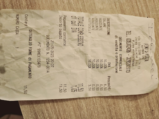 Read moreOrdino come mio solito, da tempo in questa specie di pizzeria. Da 2 anni a questa parte la qualità é sempre stata via via peggiore. Il non plus ultra il proprietario l ha raggiunto accreditandomi il costo di una piadina con 3 ingredienti a ben 8 euro. In sostanza dato che la mia piadina non esisteva, me l ha fatta pagare come una pizza, con l aggiunta di 3 ingredienti, come si evince dallo scontrino. Il pizzaiolo, un vero marcione. Insieme a sua madre e a quella specie di ragazzo che porta le...