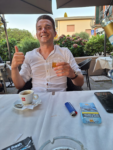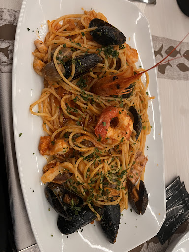 Antipasto di mare: fortunatamente tiepido e non freddo. Ottimo il polpo calloso ma non gommoso. Come primo abbiamo scelto le pennette al salmone, ottima la cottura e anche la salsa, il piatto era salato al punto giusto. Piatto abbondante ma che si lascia mangiare con gusto. Secondo orata alla piastra, freschissima, ben presentata (aperta) si scioglieva letteralmente in bocca. Contorno insalata fresca e crocchette di patate. Nel menù era compreso anche il dolce e il caffè, che avremmo preso comunque visto le premesse. Un ottimo tiramisù della casa e una panna cotta al caramello. Anche i calici di vino erano ottimi vino bianco fermo. La persona che ci ha accolto e ci ha servito si è dimostrata molto professionale e per nulla invadente (spesso il personale di sala si avvicina per avere feedback sul cibo, disturbando i clienti e per fortuna non è questo il caso). Non abbiamo dovuto attendere troppo tra una portata e l'altra, le porzioni sono giuste ti alzi sazio ma non appesantito. Lo consiglio a chi come noi dopo una giornata alle terme a Sirmione vuole mangiare bene. Unica pecca avevo un po' freddo ma probabilmente perché siamo arrivati presto per la cena, complimenti al cuoco e al personale di sala. Veri...