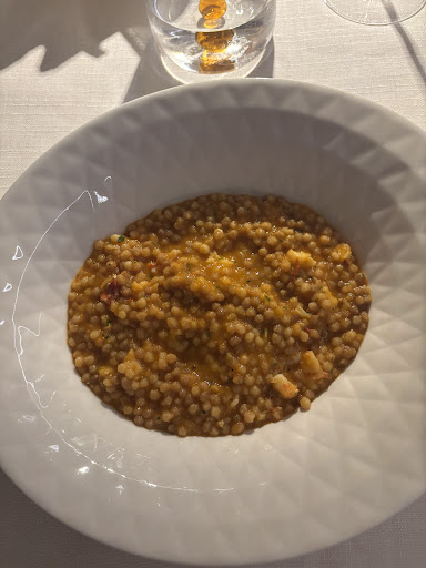 Fregua Sarda Senatore Capelli mantecata ai crostacei (astice e gambero rosso): cremosa, equilibrata e ricca di gusto.
