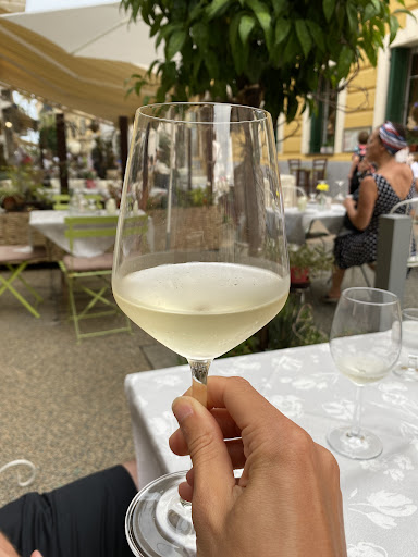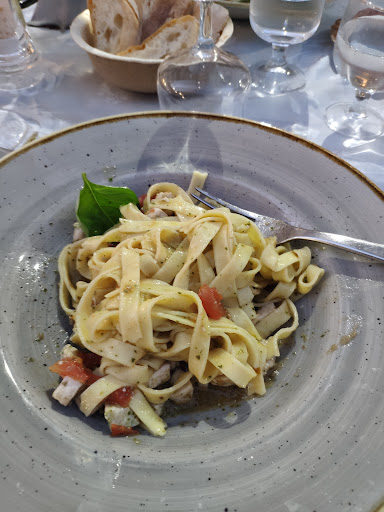 PESCE? congelato...lo vedrete anche indicato sul menù con l'asterisco "*" , quindi bene averlo dichiarato e cercare piatti diversi, infatti, altri piatti con erbe aromatiche erano decisamente migliori, ravioli di basilico con trombette e soufflé di trombette su fonduta "ma non era soufflé", quest'ultimo non aveva neanche la somiglianza....quindi meglio chiamarlo sformatino di trombette avvolto in fiore di zucca, però buono. Tornando al pesce, ravioli di pesce con sugo di calamari, nota dolente, vedere arrivare un piatto con solo pomodoro, e i calamari? se così si possono definire, avevano una pezzatura dai 2 ai 4 millimetri, praticamente una micro dadolata, passavano tra le fessure della forchetta, contati, 25 pz. sapore 0, basterebbe un cucchiaino di colatura di alici per dare un po' di sapore di mare, ed un calamaretto intero per guarnizione potrebbe aiutare, tanto da ricordare che abbiamo ordinato qualcosa con calamari. Il sugo era pieno d'acqua, se si servono i ravioli non saltati, almeno il sugo leggermente ristretto, così da non annacquare il piatto; impiattamento non pervenuto, ma sarebbe il meno se la materia prima fosse trattata bene. Fritto misto, micro quantità, striscioline di calamari, due acciughe e quattro gamberi, il tutto con un bel fondo d'olio. Probabilmente il pesce non è il loro punto forte, meglio orientarsi sui piatti tipici come quelli già menzionati all'inizio. Spesso è meglio preparare pochi piatti, con ingredienti semplici, ma buoni... Consiglio......meno congelato, con il mare davanti il fresco dovrebbe essere all'ordine del giorno, anche perché il prezzo della frittura è da pesce fresco.... spesso si spende anche di più, ma...