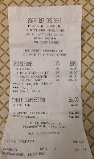Il pozzo (di sudore) del desiderio (di scappare via). Se vi piace mangiare come se foste in una fiera di paese (con tutto il rispetto per queste) al prezzo di un ristorante in centro storico e a 40 gradi, ecco questo è il posto che fa per voi. Immaginate di essere in un capannone senza aria e, dopo aver prenotato, vi riservano un prestigioso posto accanto al forno. Naturalmente la soluzione geniale del gestore del locale è di fornirvi di un ventaglio in plastica che a quelle temperature rischia di sciogliersi nel piatto. Scusate ho sbagliato... quale piatto? Già perchè nel caos di andirivieni di cameriere, molto impegnate a superare la soglia dei 10000 passi al minuto, il grande assente è proprio il piatto. Dopo 40 minuti di sauna ti aspetti un fisioterapista che ti propone un massaggio di coppia ma no! A sorpresa arrivano i piatti. Un polpo al forno che si è salvato da tutta questa bolgia ed un fritto misto di pesce che ormai era sudato anche lui, cotto di fretta, o meglio cotto parzialmente di fretta perchè al primo assaggio dei pesci (e non pesciolini come prospettato dalla cameriera) palesemente crudo perché cotto male, accompagnato dal vino che rosola sul tavolo da 40 minuti, ecco che di colpo ti senti sazio. Sazio della temperatura, sazio del caos che rimbomba in quel cortiletto con 80 persone che non riesci manco a sentire i tuoi pensieri, sazio dell'ennesimo posto in cui ti propinano la cucina e il servizio di una proloco al prezzo di un ristorante di pregio in centro storico. Ma la sorpesa non finisce qui perchè le povere maratonete/cameriere quando vengono a toglierti il piatto del fritto quasi completamente lasciato immangiato, non hanno il tempo di sincerarsi del moti vo per il quale un piatto torni in cucina, devono anche provvedere alla cassa dove, magicamente, si assiste alla moltiplicazione dei coperti da due a quattro. La fretta di andarmene da quel sudario non mi ha permesso di accorgermene subito ma... 4 euro di differenza per non tornarci direi che...