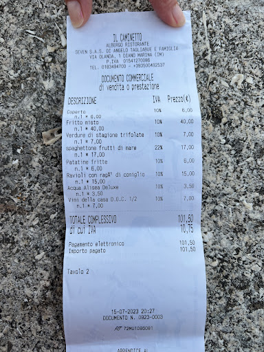Oggi siamo riusciti a fare una sfuggita romantica (in 3😂) a Diano Marina. Dopo una giornata bellissima al mare abbiamo telefonato a diversi ristoranti ma erano tutti al completo. Invece al Ristorante “Il Caminetto” abbiamo trovato posto! Yeeee!!!! Premessa, noi frequentiamo parecchi ristoranti in Liguria e sappiamo che Luglio è un mese impegnativo, quindi ci prendiamo le nostre responsabilità! Abbiamo ordinato 1 spaghetto ai frutti di mare, 2 fritti di pesce, 1/2 lt di vino della casa e 1 bott. D’acqua. Quando ci sono arrivati i fritti misti (€20 a piatto) Io e mia figlia (11anni) siamo rimaste sconvolte!!.. Piatto enorme, (solo il piatto) in centro un piccolo mucchietto di anellini (forse 7), 2 gamberi, e forse 5 o 6 alici che decoravano il piatto. Un piatto davvero inquietante, la qualità era ottima! Ma la quantità molto ma molto scarsa! Tanto che mia figlia ha dovuto ordinare un piatto di pasta!.. Insomma! Vergognoso!.. L’unico che può salvare questo locale è il personale super gentile! Non torneremo di sicuro! Scusate se non abbiamo fatto le foto ai piatti ma eravamo sconvolti, ma guardate quanto...
