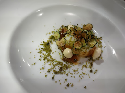 Cena leggera per due persone il 29 luglio. Abbiamo cenato all'aperto, bella terrazza, luogo tranquillissimo, parcheggio antistante la terrazza da sistemare un po'. Inizialmente ero perplesso sul menù per la quantità e l'accostamento delle materie prime, molte volte capitano menù pretenziosi e poi i piatti si rivelano "vorrei ma non posso". Non è assolutamente questo il caso. Piattino di benvenuto dello chef con due polpettine all'aglio orsino su crema di ricotta. Il buongiorno si è visto dal mattino, ottimo e delicato. Poi: Una porzione di: uovo cotto a bassa temperatura, terra all'aglio orsino, confettura alle pesche e santoreggia, zucchine al curry. Premetto che non amo l'albume poco cotto che comunque era rappreso e cremoso, piatto ben bilanciato e ben eseguito, sia come tecnica che presentazione. Una porzione di: orzotto con crema di zucchine e aglione toscano, ciliegie, salmone all'aceto affumicato. Davvero ottimo, orzo cotto magistralmente, leggermente crunch, contrappunto con la ciliegia interessantissimo che dava la giusta nota dolce acida al piatto. Salmone tenerissimo, non banale perfettamente legato al resto delle materie prime Una porzione di: polpetta di barbabietola e ricotta su crema di farinaccio, ricotta affumicata, chips di zucchine, contorno: patata Silene con salsa allo yogurt e pimpinella. Tre polpettine delicatissime, appena croccanti esternamente e morbide all'interno, buon contrasto con la ricotta affumicata. Ogni singolo ingrediente era percepibile al palato. Patate veramente buone ma, secondo me, non all'altezza delle altre portate. Un pre-dessert offerto: sacher con cremoso alla pralina di nocciole, delizioso, ottimo contrappunto acidulo della confettura di albicocca, davvero cioccolatosa. Ottimo anche il cremoso con il gusto di 'signora nocciola' con la N maiuscola, per il mio gusto lo avrei voluto appena meno dolce, ma è questione di gusti. Dessert: una porzione di Crema pasticcera alla fava tonka, crumble alla rucola selvatica, salsa all'aceto balsamico di mele Pomis, frutti rossi (fragola, mora, lampone), polvere di olive nere. Interessantissimo esempio di crostata scomposta, crema pasticcera ottima, nobilitata dal profumo della fava tonka, i contrasti croccante ed acido erano presenti in maniera bilanciata, dessert davvero delizioso. Un caffè aromatizzato al cacao e panna semimontata servito in moka monoporzione e due biscottini. Nulla da dire, ottimo fine cena Con pane (fatto da loro, molto buono), 2 coperti, un litro di minerale e due calici di friulano (buono) + 2 amari loro, uno all'artemisia ed uno al sedano/limone praticamente offerti, abbiamo pagato 82 euro, prezzo che ritengo assolutamente adeguato alla qualità dei piatti con un rapporto qualità prezzo buono. Ci torneremo per due menù degustazione, sono sicuro che ne valga la pena, anzi il piacere. Unico appunto: prima ho scritto due amari praticamente offerti perché al termine della cena viene proposto un giochino, nel quale si vince sempre (un caffè o un amaro). Per giocare bisogna accedere al loro WiFi lasciando alcuni dati personali (nome, cognome, Cell. E mail) e non è possibile selezionare l'opzione relativa alle newsletter. Fermo restando che sono correttamente visibili tutti i termini relativi alla privacy, da buon informatico avrei preferito che la richiesta di essere informato delle attività ed eventi del ristorante mi fosse stata fatta direttamente senza la scusa del giochino e dei premi. A parte questa piccola precisazione, ristorante consigliato vivamente, servizio discreto, cortese ed attento, piatti...