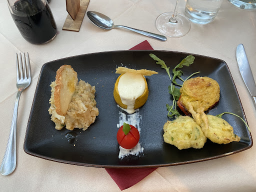 Fantastic setting. The staff was wonderful. We ordered the fixed price meal of the day. At 29 euros, it was both a good price and very special. We started with a starter plate of cod, stuffed squash blossoms and crostini. This was followed by a choice of ravioli with sage sauce or spaghetti with Bolognese sauce. Then we had a choice of wild boar, rabbit or pork. We tried the wild boar which was too salty, so we had the pork with roasted potatoes. There was a good selection of desserts and we tried two. Reservations...
