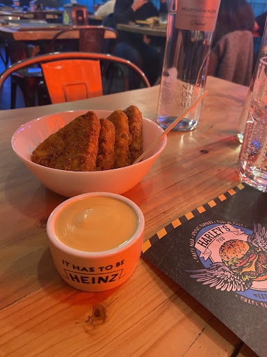 Read moreConsiglio di prenotare perché il locale è sempre piacevolmente pieno. Hanno un menù interessate da cui abbiamo scelto ed assaggiato degli stuzzichini fritti di speck e patate (in foto) buonissimi, con una salsina che abbiamo preso a parte che personalmente l’ho trovata normale, non so però il nome della salsa perchè abbiamo chiesto alla cameriera di sceglierne lei una che ci stesse bene ma non ci ha detto quale. Abbiamo preso due bin laden (panino in foto) ed un crispy, 1 birra e 2 acque. Il mio panino, con patatine incluse, era davvero molto buono, anelli di cipolla belly croccanti e carne con cottura perfetta. È sicuramente ben ripieno infatti non sono riuscita a finirlo.. la cosa bella è che c’è la possibilità di portare a casa gli avanzi. La location è un po’ troppo scura forse ma credo sia volutamente, è comunque suggestiva perchè lo stile è simil underground. carino anche il bagno con il semaforo per capire se è occupato o meno. Ovviamente la qualità è alta, ma i prezzi sono un pelo eccessivi secondo me.. per quello descritto abbiamo speso 76 euro in 3 (con coperto). Esci che sicuramente sei sazio e soddisfatto, ma se costasse un po’ meno verrei più spesso. La ragazza che ci ha servito è stata...