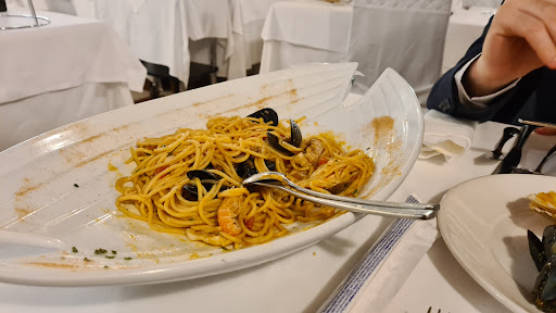 Ho anche provato gli spaghetti allo scoglio, che mi hanno sorpreso. La pasta era cotta benissimo, la salsa aveva un sapore forte di crostacei e tutti i pesci erano cotti bene, in particolare le mazzancolle erano davvero gustose. C'era anche una capasanta, che mi ha sorpreso perché non mi aspettavo che ci fosse ma è stata una fantastica sorpresa perché era cotta benissimo e aveva un ottimo sapore. La porzione era grande, ma l'abbiamo finita tutta perché era proprio buona.