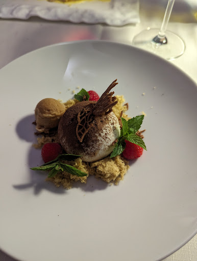 Beim Dessert hätte ich auf Käse setzen sollen. Denn erstens waren Sorbet, Semifreddo, Crème brulée und Überraschungsteil für mich zu süss. Zweitens waren drei gewollt gefrorene Komponenten auf dem Teller etwas gar viel Kälte...