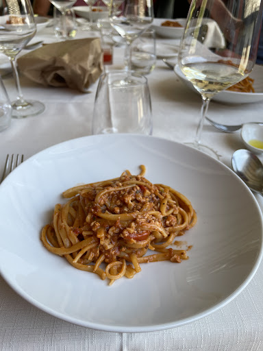 Das zweite Primo piatto mit hausgemachten Paperdelle an einem Seafood-Ragout schmeckt ausgezeichnet. Ganz vorsichtig mit dem mitgereichten Peperoncino-Öl beträufelt ist es ein Traum. Aber ich hab schon jetzt genug gegessen und muss mehr als die Hälfte unbesehen mit entschuldigendem Wort zurück in die Küche gehen.