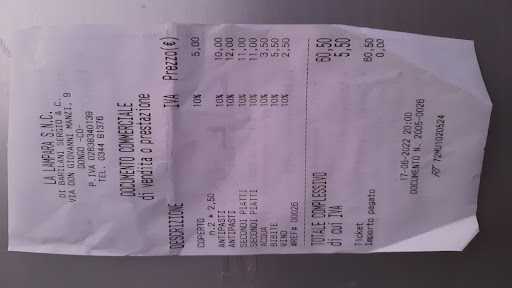 Der Service war sehr aufmerksam und wir mussten weder auf die Bestellung, noch auf das Essen lange warten. Fazit: Wir kommen gerne wieder und können das Lokal vorbehalstslos weiter empfehlen. Today we were four for lunch at La Lampara Dongo. We ordered pizza and fried calamari. All pizzas were great and the calamari were also great.