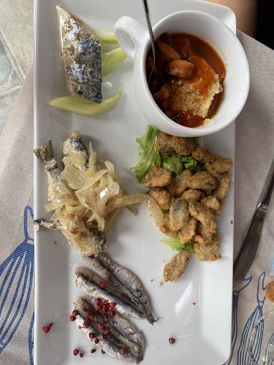 Quasi perfetto. Il posto si trova in fondo ad una strada senza uscita del villaggio dei pescatori di Duino e quindi non ci puoi capitare, devi volerci andare e soprattutto devi prenotare perché nel fine settimana è sempre pieno. I piatti sono tutti buonissimi: nell’antipasto misto c’è tutto tranne la salsa tartara che di solito mettono per accompagnare le cozza fritte. La zuppa di cozze e polenta rispetto a tutto il resto, è il piatto più neutro. Tra i primi superba la calamarata con triglia e melanzane, al posto dei cavateli ai gamberi consiglierei gli spaghetti alla chitarra ma non perché non buoni, ma decisamente meno speciali degli altri piatti. Dei secondi, il fritto è stato decisamente migliore, ma anche le polpette di cozze si sono rivelate gustose. Buoni anche i dolci e il vino. Corretto il prezzo. Ho dovuto rimandare indietro ben tre bicchieri di cui uno rotto e due sporchi, ma il personale è stato disponibile nonostante tutti i coperti da servire. Lo sottolineo non perché non fosse dovuto sostituire i bicchieri, ma sempre più spesso si trova personale insofferente e indisponente. Non si sono profusi in scuse, ma neanche hanno particolarmente sbuffato. Non sarebbe da evidenziare? Purtroppo adesso spesso si. L’ambiente è molto marinaro, anche un po’ datato ma carino con tovagliati usa e...