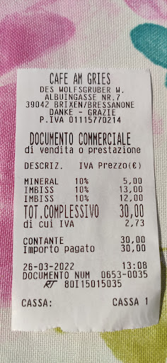 Read moreSiamo andati al Cafè Am Gries per merenda, sotto consiglio di un amico. Il locale è pulito e spazioso, il personale gentile e disponibile. C’è un‘ampia scelta di torte, tutte esposte in vetrina. Purtroppo, peró, siamo rimasti delusi! Abbiamo preso una fetta di strüdel che, nonostante sia stato scaldato e accompagnato da una pallina di gelato, non ci ha convinti in quanto slegato e poco saporito. Lo stesso vale per la Sacher, accompagnata dalla panna: la marmellata non si percepiva e il pan di Spagna era secco. Insomma, senza infamia e senza lode. Ma trattandosi di una pasticceria storica, specializzata in questi dolci (4€/l’uno), non mi sento di...