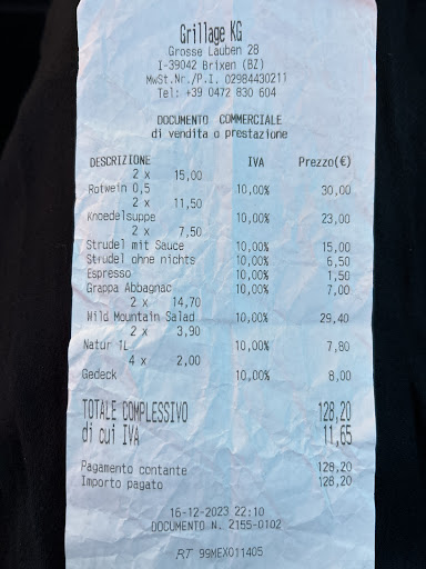 Read moreAbbiamo cenato in quattro la sera del 16/12 ordinando due canederli in brodo di manzo e due insalate di stagione con manzo alla griglia e vino sfuso Cabernet della casa non presente sul menu. Velocissimi nella preparazione del tavolo e nel prendere l’ordine ma disorganizzati nel servizio. Ci hanno portato le pietanze ancora prima di averci portato il vino, che abbiamo sollecitato, e il pane che abbiamo dovuto chiedere. Aggiunto tre dolci, un deca (arrivato un caffè normale) e una grappa.. Che dire.. l’insalata mista con verdure di stagione era composta di sole foglie di insalata con due pomodorini per decorare il piatto, il brodo di manzo era il cosiddetto brodo di dado, gli strudel decisamente nella norma e il vino sfuso proclamato di eccellente qualità dal presunto titolare nel momento in cui, dopo avere pagato il conto, sono ritornata all’interno del ristorante per chiedere spiegazioni su ciò che ho trovato conteggiato nello scontrino…. 2 x 0,50 di vino sfusi € 15/cadauno…. La cameriera a cui avevamo pagato il conto, gentile ma imbarazzata, non ha saputo darmi spiegazioni e ha dovuto chiedere confermando che lo sfuso costava € 15 x mezzo litro… ma noi abbiamo ordinato 1 litro una sola volta. Magari nella disorganizzazione avendo sollecitato il vino l”hanno segnato due volte??? L’errore ci può stare ma nel momento in cui replico che 30€ per un litro di vino della casa mi sembrano eccessivi mi sento rispondere dal presunto proprietario che il loro vino della casa è di eccellente qualità…. Buono a sapersi ho risposto…. Arrogante e maleducato segnalo sul listino prezzi, a saperlo ordinavamo un Amarone a € 47 presente sulla carta dei vini e ricordati che i clienti non sono sempre...