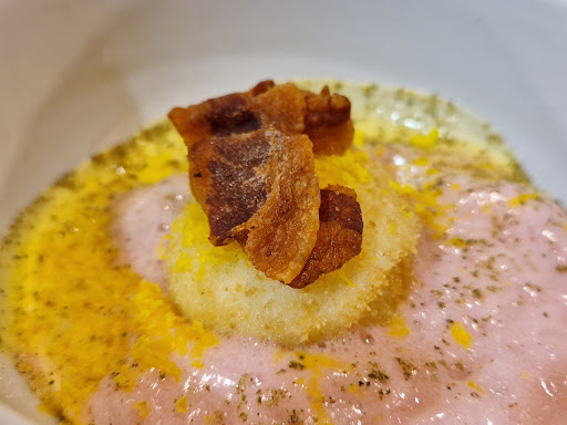 Read moreDelusione con grande entusiasmo avevo prenotato questo ristorante da cui mi aspettavo tanto. Il locale è minimal ma ben arredato, ottimo servizio Per quanto riguarda la nostra cena, abbiamo scelto il menu di Terra l'antipasto: Uovo CBT Croccante | Guanciale | Pecorino Romano | Tuorlo d'uovo e la sua bottarga | strepitoso …. dove ogni boccone si incrociavano sapori sublimi e diversi. Il primo del menu che personalmente non lo ho assaggiato mi è stato riferito buonissimo ahime' la nota dolente abbiamo (in piu' della meta' dei commensali) fatto la scelta (ci avevano proposto la possibilita' di piatti con il tartufo bianco....) di un anonimo tagliolino al Tartufo (un po' troppo pannoso) forse mi sono illusa che in un ristorante come questo il cuoco mi avrebbe portato qualcosa con quel che in piu' Il secondo: Picanha | Salsa al pepe verde | Rapa rossa | Fondo d'arrosto | Spinacio un piatto assolutamente slegato, composto da due pezzettini di carne diciamo neanche troppo tenera ma la perla finale è stato il dolce 4 pezzetti di panettone verde (suppongo siano stati al pistacchio) meno male c'era una simil o proprio nutella che ce lo faceva scivolare (ci è stato spiegato che il dolce semplice era stato abbinato per accompagnare un menu di terra impegnativo) Sicuramente il tartufo ha tirato su il prezzo ….. ma tutto questo a 95...