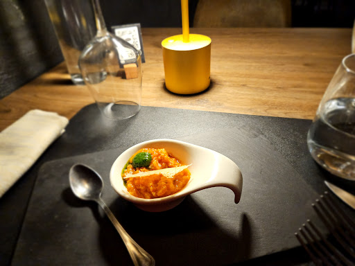 Il locale non è molto grande ma si presenta molto bene. All’arrivo vengo accolto dal personale di sala, esclusivamente femminile, molto cordiale e garbato. Mi vengono proposte alcune scelte su dove sedermi e opto per un tavolo piccolo angolare. L’illuminazione abbastanza soffusa me non eccessivamente dal lasciare al buio è gradevole e da una sensazione di calore. Mi vengono proposte le carte dei vini che presentano una vasta selezione di rossi toscani degni di nota ma sono troppo stanco per prendere una intera bottiglia da solo.
