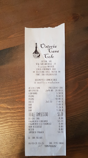 Read moreIl posto è un po' imboscato, non è segnalato, per raggiungerlo da Villa Santina Google ci ha fatto passare per una strada in proprietà privata, ed un sentiero strettissimo nella boscaglia. Arrivati all'osteria siamo stati accolti con grazia e cortesia, ci siamo accomodati all'esterno, sotto una tettoia in ombra ma ben ventilata (si stava bene) pertanto non conosco l'aspetto dei locali interni. Abbiamo scelto tra l'offerta un antipasto, un primo, un secondo ed un contorno, poi due dessert. Il cibo l'abbiamo trovato buono, senza particolari accenti. Io sono alla ricerca del frico perfetto, e purtroppo devo dire che dalla Carnia mi aspettavo di più. Ho trovato strana la scelta di servire la birra in bicchieri da 20 CL. Quello che ho apprezzato di più in generale è stato l'impegno a voler soddisfare le nostre...
