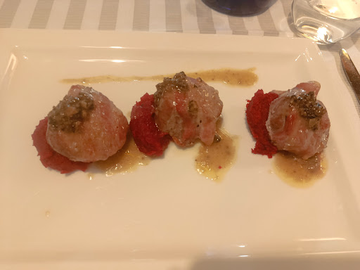 Attention, the menu does not include the IVA taxes and "Coperto". For a 20E dish, mistakes are not tolerated. Red potatoe pure was not corrected with salt/milk cream, the meat was perfectly cooked and salted. The truffle was just cut and oiled on the top of the meat (if slightly cooked you can release all of its flavour). Expensive ingredients were used but not...