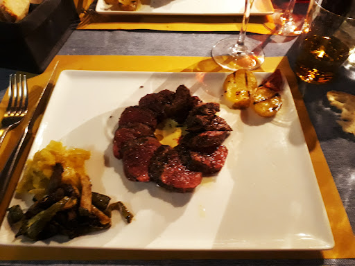 Nell'offerta dicevamo la carne la fa indubbiamente da padrona, con particolari offerte come bufalo, zebra e canguro. Lo chef è un tipo con attributi importanti, lo si capisce subito: i piatti sono stilosi e molto curati, esagerando un po'( o forse anche no) quasi delle opere d'arte, che si legano e collegano a quelle appese ai muri, in forma di quadri. Testati l'uovo poché con tartufo, l'antipasto del Cuciniere, patate alla brace ed insalata, straccetti di manzo, tartare di bufalo. Poco da dire se non complimenti: i primi 2 antipasti molto buoni, soprattutto l'uovo... ok, magari gli straccetti non rimangono nel cuore, la tartare( con formaggio erborinato) decisamente sì e pure visivamente. Ottima anche la panna cotta finale, con salsa al mango se non erro.