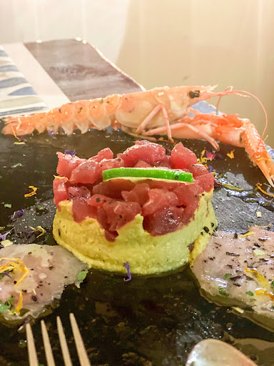 Read moreOttimo ristorante su tutti i punti di vista; location molto intima adatta anche a serate romantiche. Servizio molto cortese e disponibile. Cucina ottima con abbinamenti a volte non scontati. Si viene accolti con un calice di prosecco e un Entrée molto particolare servito all'interno di una pietra, buonissimo, si continua con un bellissimo antipasto freddo composto da 7 assaggi finemente decorati di varie tipologie di pesce, poi l'ottima la carbonara di pesce con l'aggiunta di pistacchi sbriciolati ed infine un sublime dolce, la zuppa inglese, molto classica ma ottimamente realizzata con l'inserimento anche di amarene e palline di meringa. Conclude l'ottima impressione anche il conto decisamente adeguato ai piatti scelti e comunque per niente oneroso. Và menzionato anche il fatto che nel cestino del pane vengono inserite varie tipologie di pane molto particolari, grissini e pizze bianche il tutto evidentemente fresco e prodotto in casa. Consiglio assolutamente di provare il locale che Vi convincerà, come a convinto a me, a...