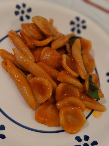 Le orecchiette al sugo, semplici e poetiche, sono un manifesto di italianità: la pasta fatta a mano raccoglie ogni goccia di pomodoro, evocando pranzi della domenica e mani infarinate.