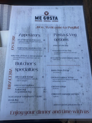 Went out for dinner tonight to Me Gusta based on what I’d read on Google reviews and it did not disappoint! I had the pleasure of being served by Patriscio (Patrick) the owner, and what a delightful chap. Happy, helpful and available to explain everything needed…. A simple menu, with simple Italian staples and Patriscio was very proud of how everything was local except for the beer. And so much of it home made. From the desserts to the pastas to the limoncello… wow! I opted for the Entrecôte Argentino- €50/kg but remember. Who’s gonna eat a kg! I had a lovely 200g piece along with a delicious jacket potatoe which had simple olive oil, salt and pepper. Initially I thought this would be bland… but it wasn’t at all. Every bite was delicious and flavoursome! Tasting the real flavours of the food.