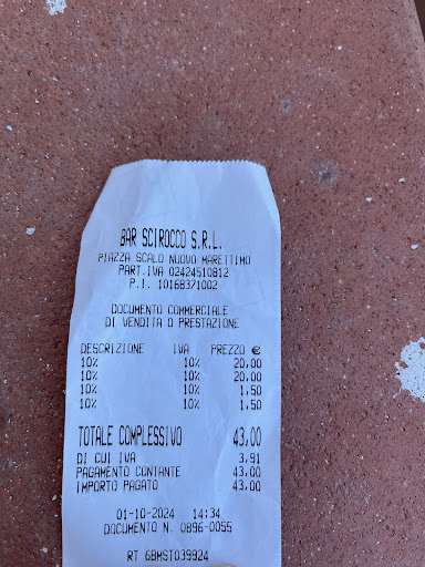 Read moreAbbiamo scoperto quasi per caso, grazie a due genovesi alla nutella , questo posto. Vorrei partire dicendo a tutti che le persone che ci lavorano sono speciali, a partire dal proprietario Marco, che ama il suo lavoro, e si vede, ma soprattutto mette passione in tutti i piatti che serve, tutto quello che abbiamo mangiato é stato fatto da lui e vi assicuro che si sente la passione di un uomo che quando lavora ci mette tutto il suo amore in quello che fa. Questa passione si riflette anche sul personale, baristi gentilissimi e scherzosi, sempre pronti ad accogliere il cliente e a farlo sentire a proprio agio, anche con qualche battuta divertente. Del cibo che dire, SPAZIALE, tant’é che ci siamo portati dietro alcune paste del bar che ci mangeremo prima di partire. Consiglio a tutti di andare a conoscere il Bar Scirocco,vi sentirete a casa.