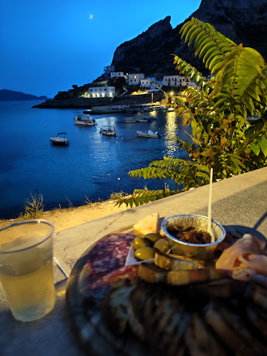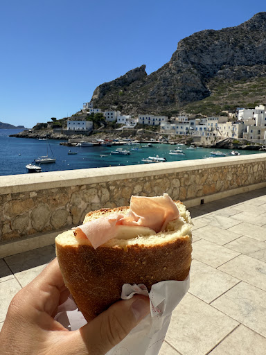 We stopped at la chicca for an aperitivo (start at 18h)... 12 euro for a glass of wine an Aperol Spritz (small) and some typical Italian tapas (mortadella, cheese, caponata, ... ) while waiting for our ferry back to Favignana.