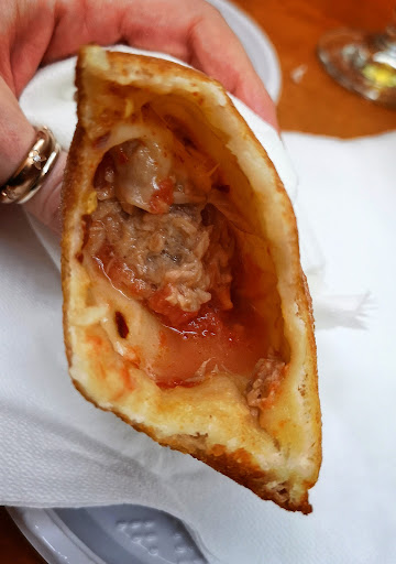 Panzerotti praticamente bagnati di sugo,senza niente dentro. Panzerotti che sa fare chiunque,di forma piccola, grandi quanto una mano. Anni fa li mangiavo lì a Ferrandina,ma nn era quello il posto perché era molto piu lontano dalla Piazza,ed erano ben farciti e 3 volte piu grandi e grossi. Comunque,chi li ha mangiati sa che nn sono niente di ché,mangiabili ,ma ti sembra di mangiare niente alla fine.