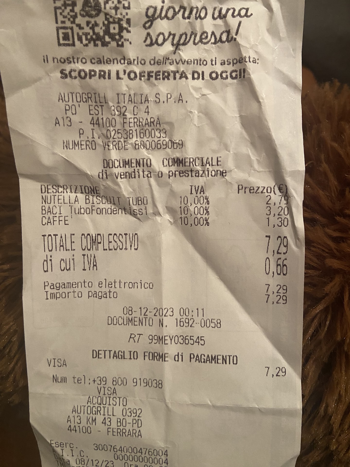 One of the best "truck stops" I've ever seen. Fresh food cooked to order. Bring in Italy, everything was in Italian. I picked the carbonara item from the menu. I practiced how to place the order in Italian, repeating it over and over on my head. I ordered it. The order taker must have understood me, because she told me no carbonara today. I was lost and just pointed to the meatballs. The parts and meatballs were great. We also picked up some snacks for the bus ride and some small souvenirs.