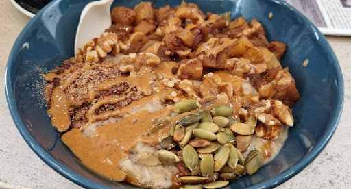 Durante la mia visita, ho provato il loro porridge. Servito in una ciotola blu scuro, il porridge si presenta con un colore ricco e invitante, che promette un’esperienza gustativa deliziosa. Le fragole fresche sono disposte attorno al bordo della ciotola, come se fossero petali di un fiore. Il loro colore rosso brillante contrasta splendidamente con il blu della ciotola, creando un effetto visivo accattivante. Al centro della ciotola, due fragole intere formavano un cuore, rendendo il piatto non solo delizioso, ma anche visivamente attraente. Il porridge stesso era piacevolmente caldo, offrendo un conforto immediato non appena lo assaggi. La sua dolcezza è delicata e naturale, derivante dai frutti freschi e maturi utilizzati nella sua preparazione. Non è troppo dolce, ma giusto, rendendo ogni morso un piacere.