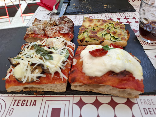 Read moreQuesto locale è situato circa a 150 metri dal Duomo, quindi in pieno centro storico. Si trova sotto dei portici e ha dei tavolini all'esterno contornati da piante. All'interno si nota subito la ricerca del dettaglio nell'arredamento, il logo è molto ben visibile e caratterizzato, tavolini curati e una bella vetrina con in mostra le varie offerte di pizza proposte e specificati gli ingredienti e prezzi al trancio. Abbiamo preso 3 tranci di Margherita, scaldati al momento al prezzo totale di € 12,00. Il sapore ci ha pienamente soddisfatti in quanto si sente che gli ingredienti sono di alta qualità. I due ragazzi che ci hanno servito sono davvero molto gentili e...