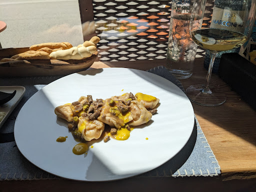 Super nice view, right in front of the castle of Ferrara. I give it 5 stars, it is on the pricey side, but for a good reason. Superb selection of wine, not many but top and carefully picked. The food is tapas-type, including some revisited Italian dishes. I had the "bigoli" (hand made pasta) with boar gravy, pecorino cheese and fava bean (and thyme). It was truly delicious, it melted in my mouth. The tapas I had were acciughe (anchovies) del cantabrico and crostini (mixed flavours). Everything was well prepared, well presented in a nice atmosphere. I...