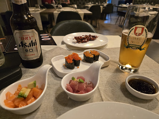 Het eten was heerlijk. Vers en mooi opgediend. Wij komen uit Nederland en daar kan je de sushi per ronde bestellen en via een app. Hier ging het er veel gemoedelijker aan toe door het gewoon op een notitie in je telefoon te schrijven en de bediening nam dit dan over in hun telefoon. Lijkt omslachtig maar wij vonden het wel prettig.