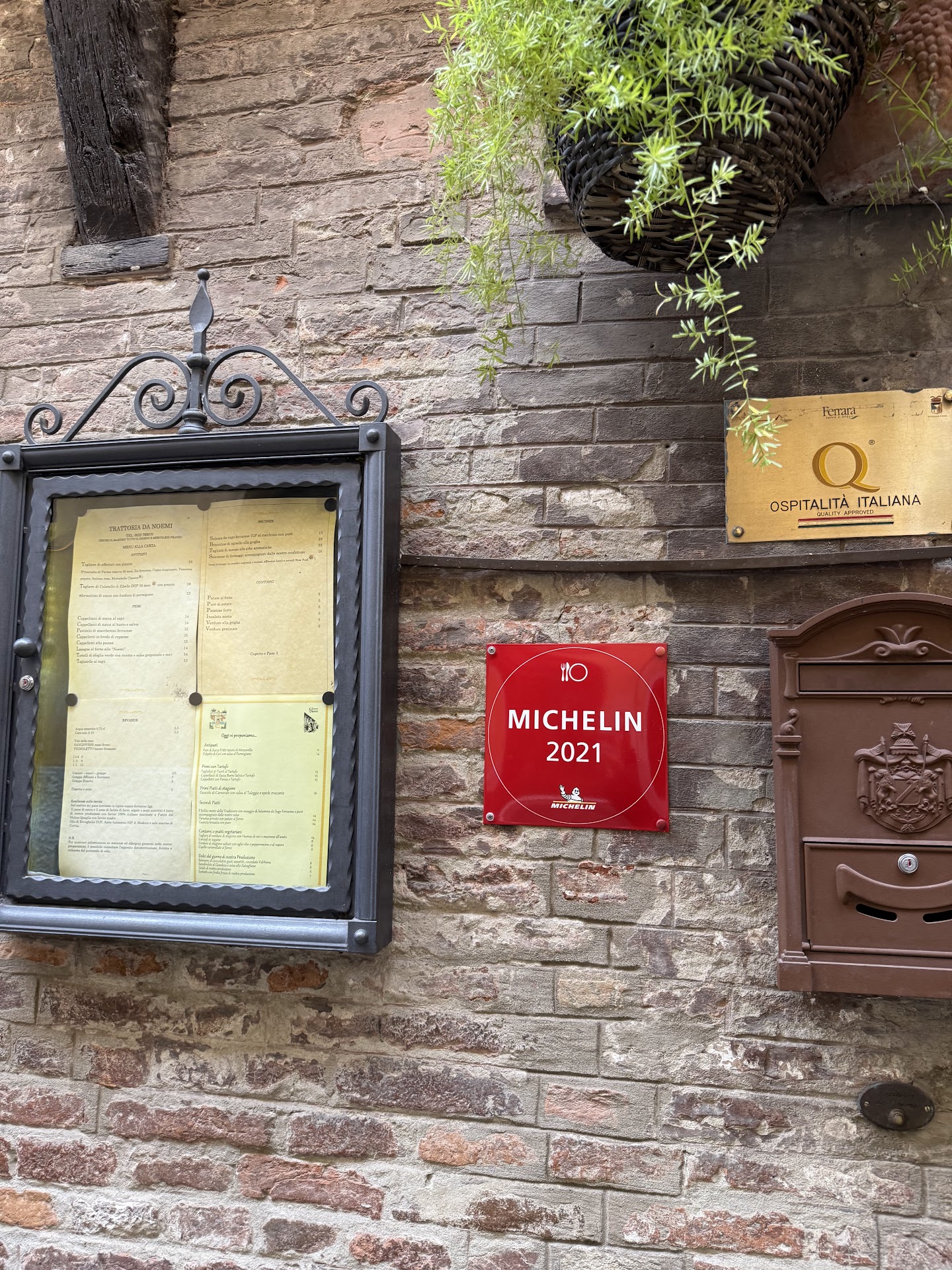 Mi avevano parlato di questa trattoria nel centro storico di Ferrara come un isola felice dove consumare prelibatezze locali con tanto di Chef stellato e segnalata dal gambero rosso e guida Michelin. Quindi prenoto un tavolo per cena all'esterno perché mi viene detto al telefono che all'interno non c'era posto. Arrivo puntuale all'ora designata e scopro che il mio tavolo è l'ultimo della fila e attaccato ad una fioriera enorme, così che la mia compagna è stata costretta a sedersi al lato del tavolo invece che di fronte, come si conviene ad una coppia e come tutte le altre coppie di commensali presenti quella sera erano sistemate ai tavoli per due. Ordiniamo dei fiori di zucca come antipasto, due primi tra cui tagliatelle ai funghi porcini e dei cappellacci al ragù, piatti tipici della zona. Come vino la scelta ricade su due calici di Gewürztraminer. Viene quindi servita dell'acqua minerale non gasata come richiesto e del pane. All'arrivo del vino ci viene fatto prima assaggiare, come si conviene, ma ahimè il vino è appena fresco e non freddo come dovrebbe per esaltare la sua fragranza. Ci viene quindi subito sostituito con un altra bottiglia del medesimo vino ma prelevata da un altro frigorifero perché l'altro da cui proveniva la prima bottiglia "non funziona bene"(???) come asserito dalla cameriera che ci serve al tavolo. Ci vengono portati anche altri due calici. Dopo poco arrivano i fiori di zucca con uno strano aspetto : piccoli come un blister di rossetto e abbastanza scuri all'esterno. Forse rimasti una manciata di secondi di troppo nella friggitrice, ma tutto sommato di sapore gradevole. Nel frattempo il pane, dei piccoli pezzi di tipo diverso e servito in una piccola fiamminga di metallo, tra le varie attese era terminato. Così la cameriera gentilmente ci chiese se ne volevamo dell'altro, ed io accettai volentieri. Peccato che non arrivò mai al nostro tavolo. Passiamo ai primi : le mie tagliatelle ai funghi arrivano ben calde, ben condite e giuste di cottura; i cappellacci invece arrivano tiepidi e semi crudi. Sorvolo sulla cospicuità dei piatti.... Chiediamo del formaggio grattugiato e la cameriera torna con una ciotola ma non la lascia al tavolo; ce ne sparge un cucchiaino a testa e se la riporta via. Come dessert ordiniamo un tiramisù fatto da loro in casa ed effettivamente era molto buono. A fine pasto viene il capo cameriere, gentilissimo, chiedendo se tutto era andato bene. Cerco allora di illustrare cosa secondo noi non era andato per il meglio. Il cameriere si scusa e ci chiede se volevamo altro. Rispondo di no e chiedo quindi il conto che arriva celermente in forma di pre-conto da regolare . Mi alzo e vado io in cassa per accelerare i tempi e durante la mia attesa davanti la cassa deserta, durata svariati minuti, vedo che in sala c'era un bel tavolo da due già apparecchiato e vuoto. Non ho neanche chiesto se fosse prenotato, ma dubito che a quell'ora aspettassero altri clienti. Tutto sommato credo che non tornerei a...