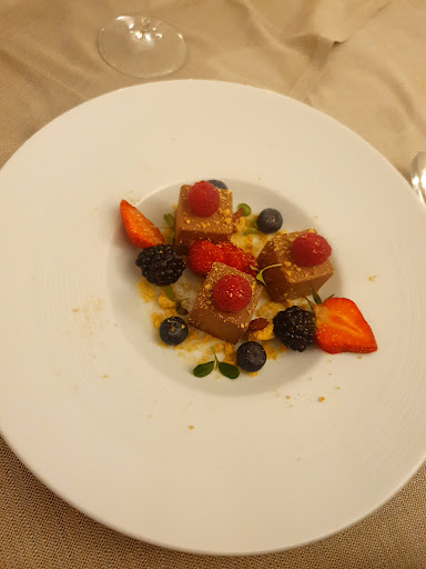 Read moreCi siamo fermati la nostra ultima sera in luna di miele in Sardegna per una cena romantica e mai scelta fu più azzeccata. Tutto veramente perfetto, dalla location con un panorama mozzafiato di cui non abbiamo potuto godere per via del freddo. Ma credetemi il panorama è veramente stupendo. La location bellissima ed elegante, lo staff meraviglioso, disponibile e attento alle nostre esigenze. Il maitre di sala ci ha guidati nella scelta del vino abbinandolo perfettamente ai nostri piatti ( un vermentino del 2021AZZESU, un vermentino di Sardegna doc ottenuto da un vigneto di montagna sul monte Pelao, un vulcano spento posto nelle campagne tra Bonnanaro, Borutta, Bessude, Thiesi. Questo vino ha reso tutti i piatti ancora più buoni! Ma veniamo appunto ai piatti. Abbiamo preso come antipasti: insalata di polpo di granchio con avocado e chips di pane cosa dire divina,ne avrei mangiato un altro piatto! insalata di polpo con mozzarella, pomodoro e asparagi, buonissima. Abbiamo continuato scegliendo come primi: fregola nera con lime, yogurt e gamberi( deliziosa da mangiare già con il naso per l'intenso profumo che emanava). risotto con zafferano, dolce sardo e funghi porcini, veramente molto buono. La cena è poi continuata scegliendo come secondo il pescato del giorno: rombo con cozze e patate il tutto accompagnato dal fondo del pesce con olive taggiasche, gusto paradisiaco. Abbiamo completato questa meravigliosa cena con due dessert: sorbetto fatto davanti a noi con menta, limone, cacomela, uva e cioccolato, ottimo da abbinare ad una cena di pesce. mousse al cioccolato fondente con GELÈ di mandarino, lamponi, mirtilli, more e fragole. Vale la pena venire al Golfo Aranci non solo per la bellezza delle acque ma anche per poter assaggiare i meravigliosi piatti del blu restaurant. Noi sicuramente sappiamo che ci torneremo volentieri perché ci hanno fatto toccare il cielo con un dito e hanno reso la nostra ultima sera in questa terra magnifica,...