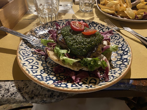 Passando ai piatti, abbiamo ordinato diverse pietanze interessanti. L'hamburger di fassona con salsa chimichurri e pane alla curcuma è stato una scelta intrigante. Tuttavia, abbiamo notato che la quantità di salsa chimichurri era eccessiva, al punto da sovrastare il gusto del piatto. Mettendo da parte l'eccesso di salsa, abbiamo potuto apprezzare meglio il sapore dell'hamburger.