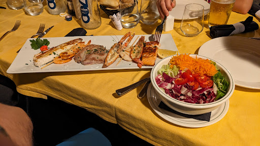 Pedimos una pizza calzone, una pizza carbonara, un plato de pescado con marisco a la parrilla, ensalada de complemento, y verduras a la parrilla de complemento. También 2 postres, un riquísimo tiramisú y un crocante relleno de crema. Éramos 4 adultos y 2 niños, y casi no logramos terminar todo. En total 105€.