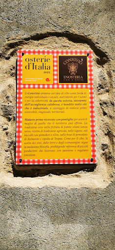 Read moreÈ difficile descrivere l'esperienza vissuta da Convivio. Passeggiando per questo splendido borgo medievale abbiamo trovato un cortiletto pieno di tavoli in legno sotto una splendida buganville ed abbiamo deciso di fermarci a bere qualcosa... Un ragazzo molto gentile ci ha spiegato la filosofia del locale, dalla cucina a km zero ai metodi di cottura della tradizione antica, così mentre gustavamo la nostra birra artigianale calabrese ci siamo incuriositi ed abbiamo deciso di aspettare l'apertura della cucina. È arrivato il proprietario che con gentilezza, orgoglio ed amore per il suo lavoro ci ha spiegato il piatto tipico "la frittata di patate senza uova" cotta a lungo come una torta. Ci ha detto "vado in cucina e faccio io" decidendo lui cosa servirci: una serie di antipasti buonissimi!!! (Parmigiana di melanzane da 10 e lode!) E non è finita qui! Quando vado a pagare alla cassa chiedo una fetta di dolce della casa da portar via, la ragazza al bancone mi spiega che non fanno take away perché non usano la plastica e non sapeva come darmi il dolce, così lo ha messo in una teglia in alluminio, mi ha regalato una forchettina d'acciaio e quando mio figlio ha chiesto una seconda fetta (era l'ultima della torta) mi ha regalato anche quella! Conto onesto, anzi mi sarei aspettata di pagare di più. Pochi sono i posti in Italia con un così grande rispetto dell'ambiente, ed un amore per i propri ideali più grande di quello per il denaro. Si meritano 10 stelle!!! P.S. Il locale interno è molto carino con grande attenzione ai particolari (ho trovato anche un...