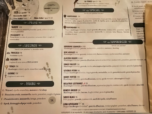 Read moreDietro la storia di Harry Potter sono nate un infinità di attività commerciali, questo locale a tema Harry Potter è stato fatto con cura ed attenzione ai dettagli, ma ahimè, molti dettagli della vita reale sono stati trascurati. Già da fuori i gestori hanno deciso bene di dare un tema al muro ricreando così un classico muro della stazione londinese, con il noto ( agli appassionati ) binario 9 3/4. Una volta entrati l'attenzione viene subito rapita dal tetto che richiama la magia della sala grande con le lettere che sembrano volare quasi per magia. Alla sinistra dell'ingresso, la cassa è stata anch'essa allestita a tema ( complimenti per l'idea ) nella famosa banca del film, piccola ma geniale. Percorrendo la sala ci sono diversi tavoli, a sinistra e destra sul muro tanti quadri di "maghi e streghe" famosi e poi per ricreare la magia del film,con i personaggi dei quadri che si muovono hanno usato dei monitor con alcuni video in loop dove dei personaggi ( credo i gestori stessi ) si alternano in ipotetici dialoghi col cliente per poi andare via, "non possiamo pretendere che restino sempre lì", ma per quanto bella sia l'idea, non c'era l'audio, quindi quella "magia" scompare quasi subito, peccato! Andando Ancora più avanti, andiamo in quello che il centro del locale, con un grande camino e un muro che richiama uno dei messaggi che compare nel film la camera dei segreti. Più avanti ancora una altra saletta con un angolo dedicato a ricreare il laboratorio di pozioni. Il locale è stato curato, davvero complimenti, ma se usciamo dalla magia e dalla bellezza che hanno ricreato per gli appassionati, ci sono dei disservizi che non vanno che non fanno andare la mia recensione oltre le tre stelle. Iniziamo da subito col dire che la sala non è climatizzata, posso capire che avrebbe "rovinato" l'aspetto degli arredi, ma esistono dei metodi per integrare dei condizionatori senza rovinare il tutto, infatti per risolvere il problema del caldo ( evidente a tutti ) c'erano ventilatori ovunque, che non sono proprio belli da vedere. Il panino non è, ne buono ne cattivo, alcune foto nel web sono davvero ben fatte e fanno vedere qualcosa che poi non è proprio quello che si troverà nella realtà. Il pane di scarsa qualità, gommoso nemmeno se fossimo al Nord Italia, i prezzi sono medio alti. Dopo aver ordinato le birre per accompagnare i panini, chiediamo dei bicchieri per versarle e i ragazzi della sala ci dicono che non hanno bicchieri. Non so cosa dire in merito! Ultimo, no per importanza, la Burrobirra, famosa bevanda del film, ne ho assaggiate diverse e sono consapevole che essendo una bevanda "inventata" ognuno la fa come vuole; la presentazione è ottima ma il sapore a nostro gusto è davvero inbevibile. Un mix di miele, caramello, birra analcolica, panna e ancora caramello di sopra, nella ricetta ufficiale della Warner Bros negli Studios è totalmente un altra cosa. In conclusione, il locale è bello vale la pena andarci se si è appassionati del genere, ma se dovessi scegliere questo locale per qualità del prodotto non ci tornerei facilmente. Consiglio ai gestori di migliorare alcuni punti, che poi col tempo sono quelli che servono per...