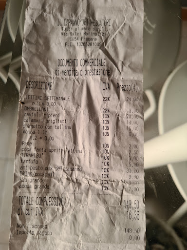 Read morePessima esperienza già dalla tovaglia, probabilmente utilizzata come appoggio per i piatti sporchi del tavolo accanto. In una bella giornata di sole il tavolo interno sotto la finestra non ombreggiata ci ha fatto rimporre anche il buon vino scelto, che si scaldava non appena versato nel bicchiere. Tempi d'attesa: venti minuti per ordinare da bere; altri dieci per ordinare il cibo; da qui ci vuole mezz'ora per dei moscardini luccicanti di olio di frittura (non assaggiati nemmeno) e sauté cozze e vongole che però avevano perso le vongole tra la cucina e il desco; ulteriori quaranta minuti per dei primi degni di poca nota nonostante fossero i piatti del giorno e la pasta fosse cotta alla perfezione. Insalata ordinata "al volo" (per mia incauta fiducia) attesa per venti minuti e mai pervenuta (per fortuna non mi sono trovata a doverne contestare il pagamento visto che non è mai stata inserita nella comanda). Chiaramente non prendiamo caffè, dolci o amari perché non vediamo l'ora di andarcene, ma corro a pagare il conto ormai cotta dal sole che per tutto il tempo ha insistito sul tavolo, senza che nessuno del personale proponesse un cambio nonostante nel frattempo se ne fossero liberati diversi, e rimango male dei 50 euro a persona "non riscossi" sul documento commerciale - per fortuna pago con il bancomat ed il nero è un po' meno nero... Capisco la giornata festiva di inizio stagione, ma faccio presente al gestore che il 25 aprile è festivo in Italia da 77 anni, un tempo sufficiente per organizzarsi! Nota positiva: il parcheggio interno. Ma non vale il...